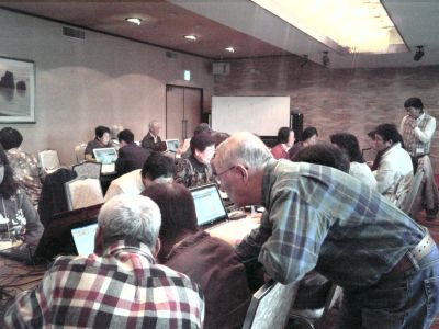 | 13回目 | 10月 4日 | 色々と行事の多い10月 予想に反して今迄で一番多い53名の参加者が有りました。 クーラーがほしいくらいの暑さに少々ばて気味に・・・ 前半は(花札遊び)インターネットの無料ゲームの使い方 昔取った杵柄?だとす〜す〜とゲームに入っていける方 花札なんてはじめてと悪戦苦闘してる方とそれぞれに・・・ 後半はいつもの様に エクセル・ワード・デジカメ の復習 |
