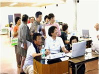 みんな画面とにらめっこ 今日の「うちわ作り」にはお助けの人達の働きが目を引く |