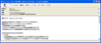 (3) 名が字崩れもしくは空になっていないか件名が字崩れもしくは、空になっているメールに対しては必ず送信者に連絡を取って、しっかり確認してから開くようにして下さい。もし、送信者の方が「そんなメール送った覚えがないよ」と言ったなら、送信者の方がウイルス感染しているか、どこかで送信者の名前が盗まれたのかもしれません。また”Re”だけで送ってくるメールに対しても要注意です。